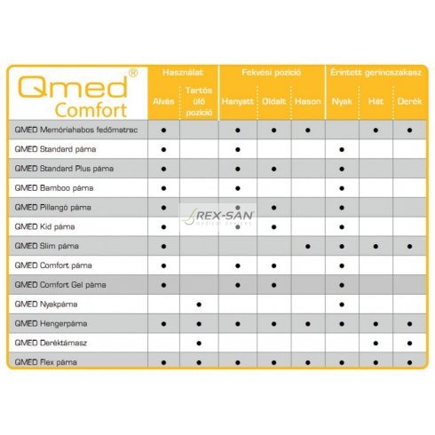 A memóriahab (hőre lágyuló, nyomásra érzékeny viszkoelasztikus poliuretán) anyag speciális tulajdonságai lehetővé teszik, hogy a fekvőfelület alakja teljesen hozzáigazodjon az adott testtáj formájához a kényelmes és egészséges pihenés érdekében. A QMED memóriahabos termékcsalád tagjai használat, alvási pozíció és az érintett gerincszakaszok szerint: (lásd a képek közötti táblázatban)
